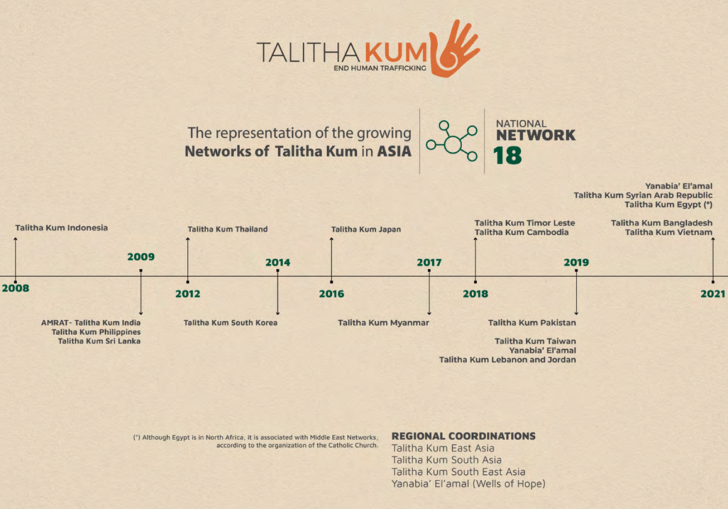 Talitha Kum Asia continued to organize and contribute to the special event of February 8th, the International Day of Prayer and Awareness Against Human Trafficking, as well as the World Day Against Trafficking in Persons on July 30. Currently, the development of Talitha Kum “Training Manual, Manual for Call to Action and Guidelines for Youth Ambassadors,” through the effort of its formation team, are now in place for capacity building training of new members.